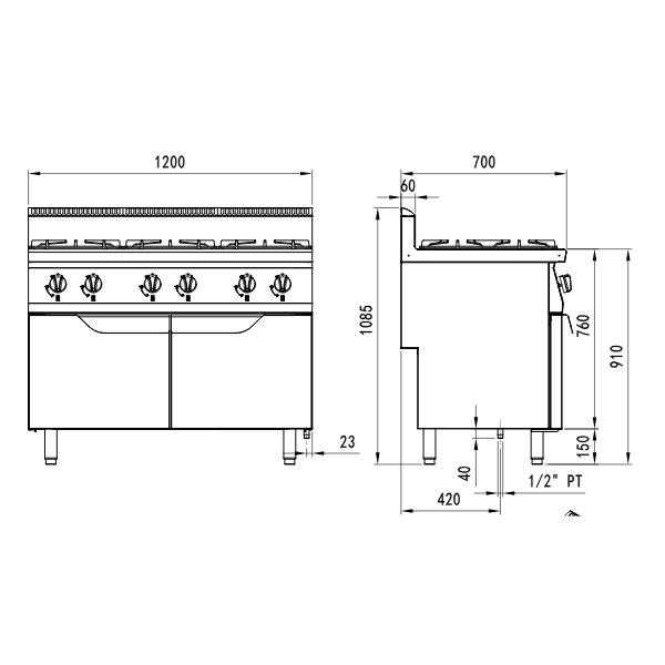 El Fogón de gas natural con 6 quemadores serie 700 – 1200x700x1085mm 31.5KW – 3×3,5kW + 3x7kW de la marca Atosa está diseñado para ofrecer durabilidad y funcionalidad en entornos de hostelería. Fabricado en acero inoxidable, garantiza una excelente resistencia a la corrosión y facilita la limpieza diaria. Perfecto para restaurantes, hoteles y cocinas industriales que buscan equipos profesionales de larga vida útil.