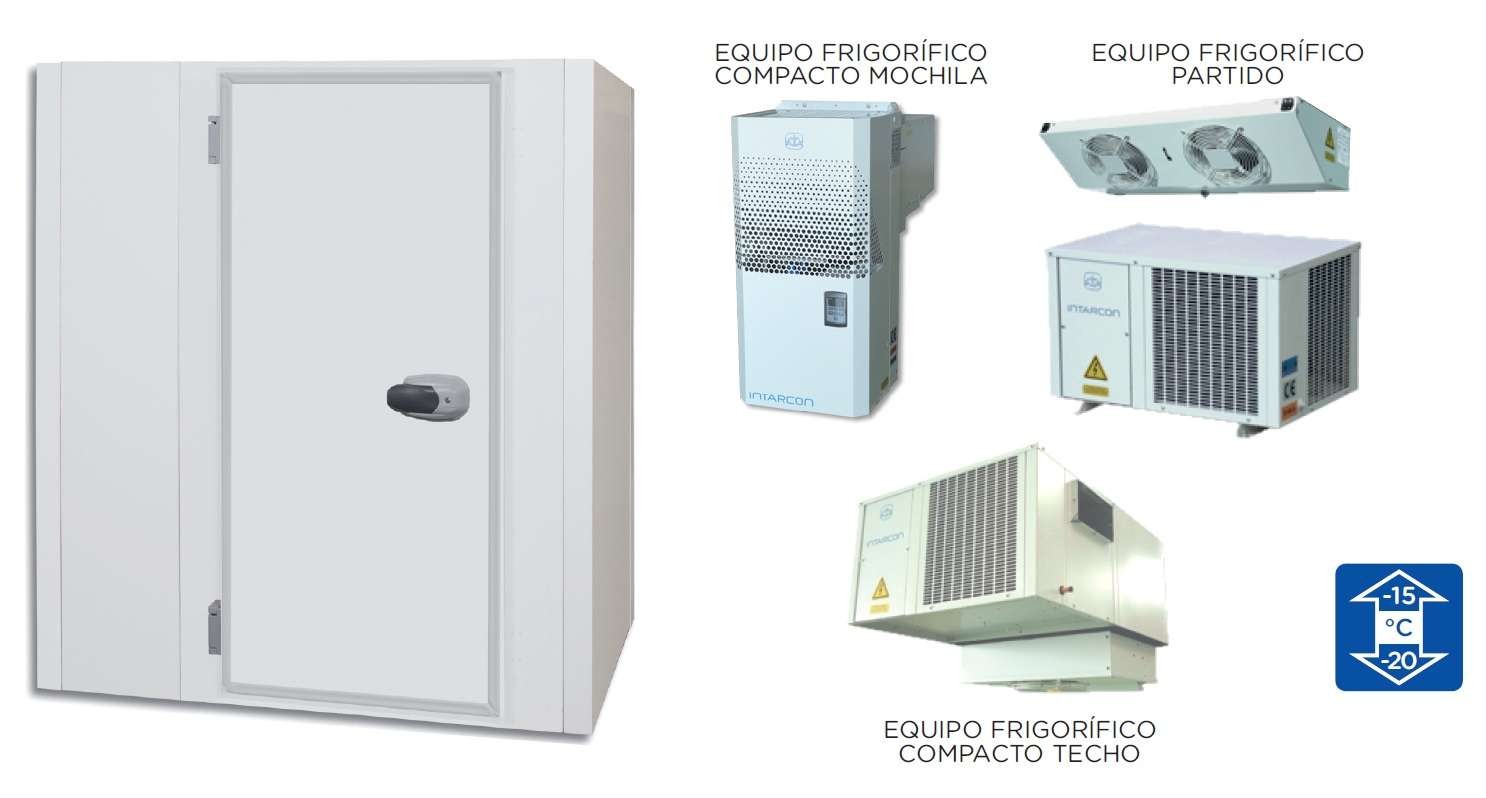 Cámara Frigorífica Temperatura Negativa dim.ext.2170x2170x2000h mm con suelo, aislamiento de 85mm, puerta pivotante de luz 1830X700mm y perfiles